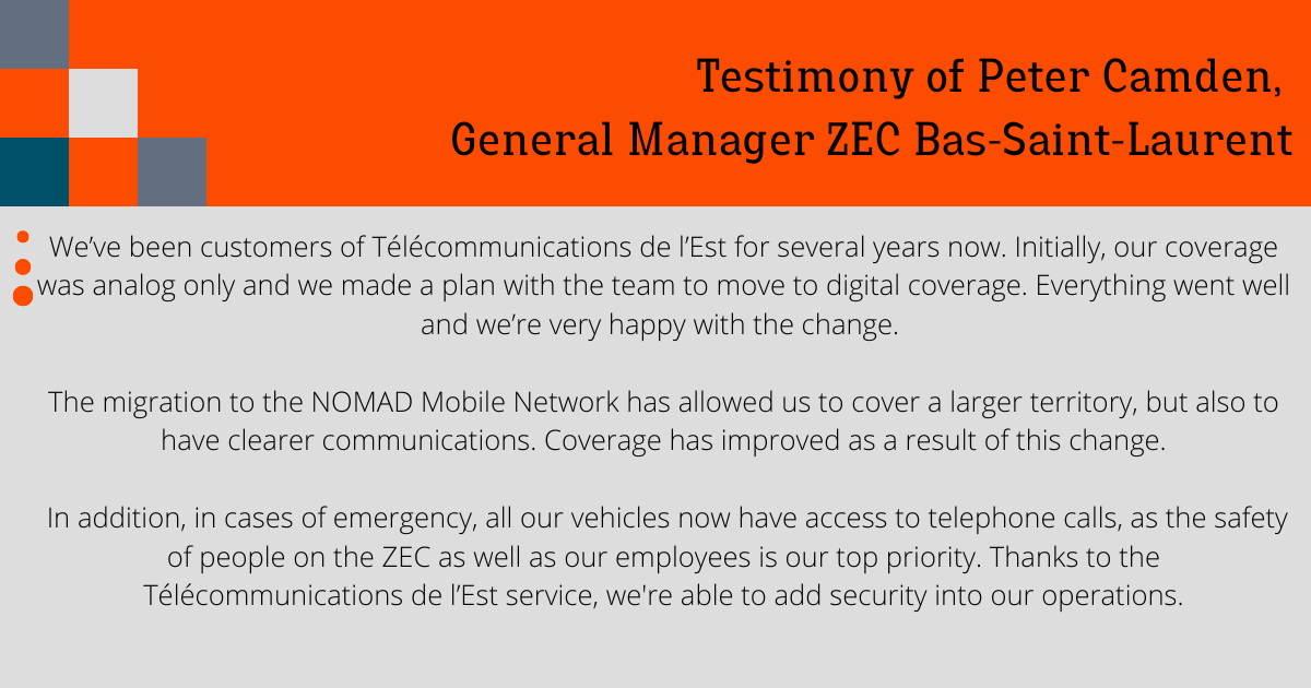 The advent of NOMAD Mobile Network coverage is also applauded on Anticosti Island, where it will enable vacationers, residents, utilities and businesses to communicate within the island’s 222-kilometre-long territory and with the rest of the world. The same is true in central New Brunswick, where cell coverage is poor despite considerable development of the rich natural resources.
