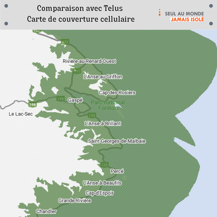 Le Réseau mobile NOMADE a pris de l'expansion dernièrement avec la mise en service de deux nouveaux sites. Le site de Cap-des-Rosiers situé dans le Parc national Forillon ainsi que le site de Percé se sont ajoutés à celui de Gaspé centre-ville. Seules les parties vert foncé de la carte ci-dessus ne sont pas dans la zone de couverture.